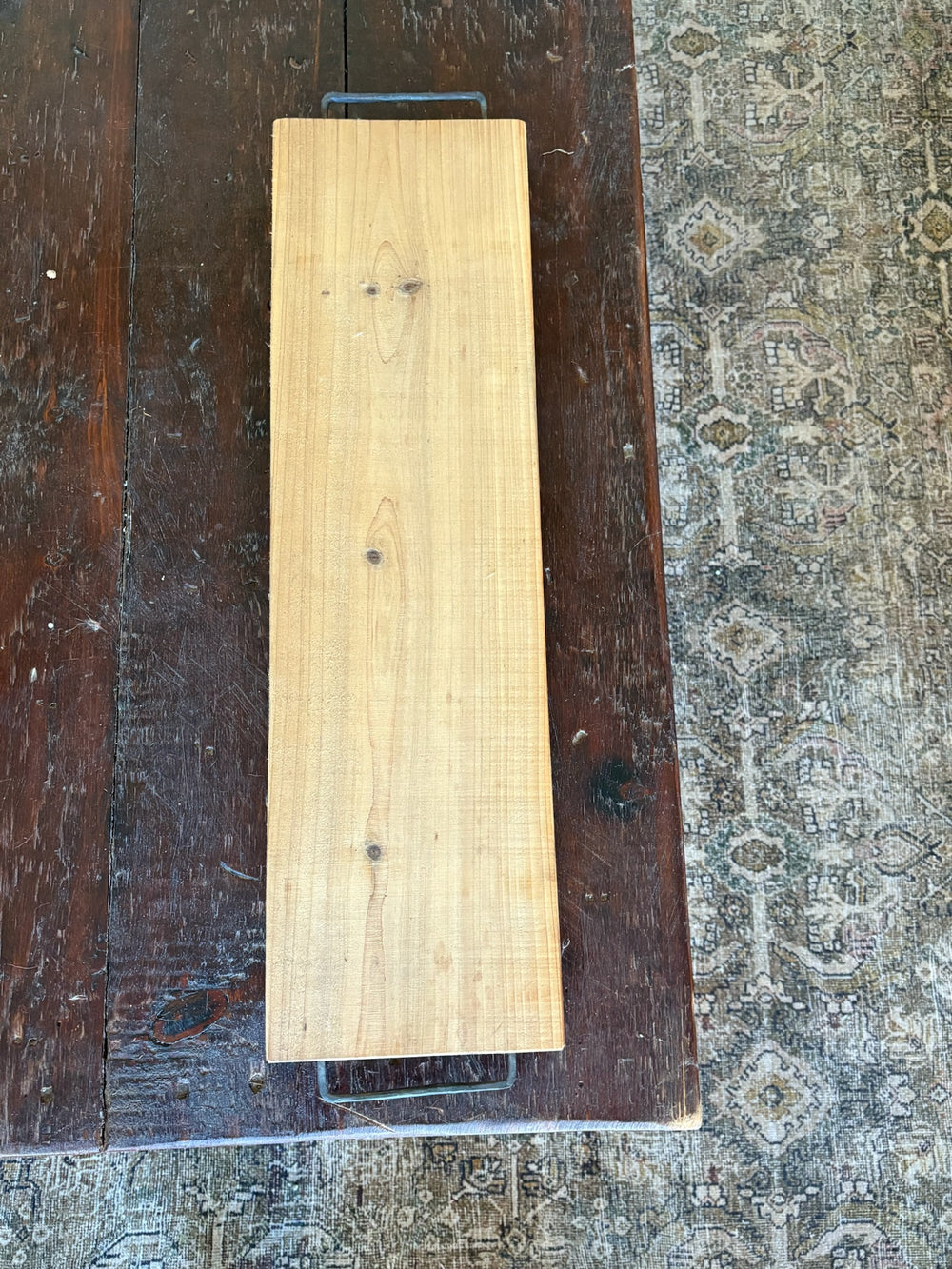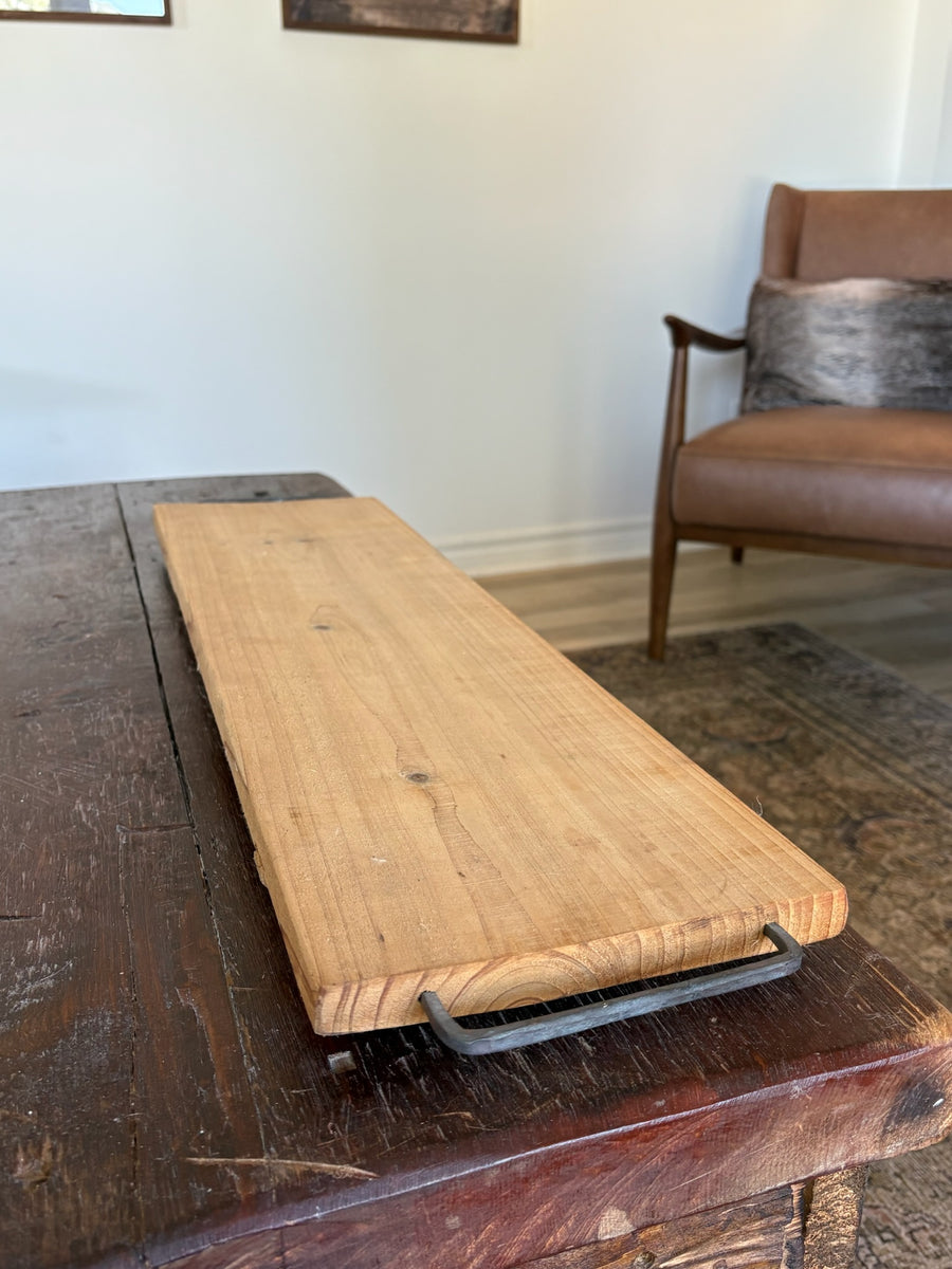 A versatile wooden board with built-in handles, measuring approximately 29.5" long by 9.5" wide. Use it as a serving piece or as part of your tabletop decor—easy to layer, simple to style. Each board is unique and may vary slightly in tone, grain, and markings.